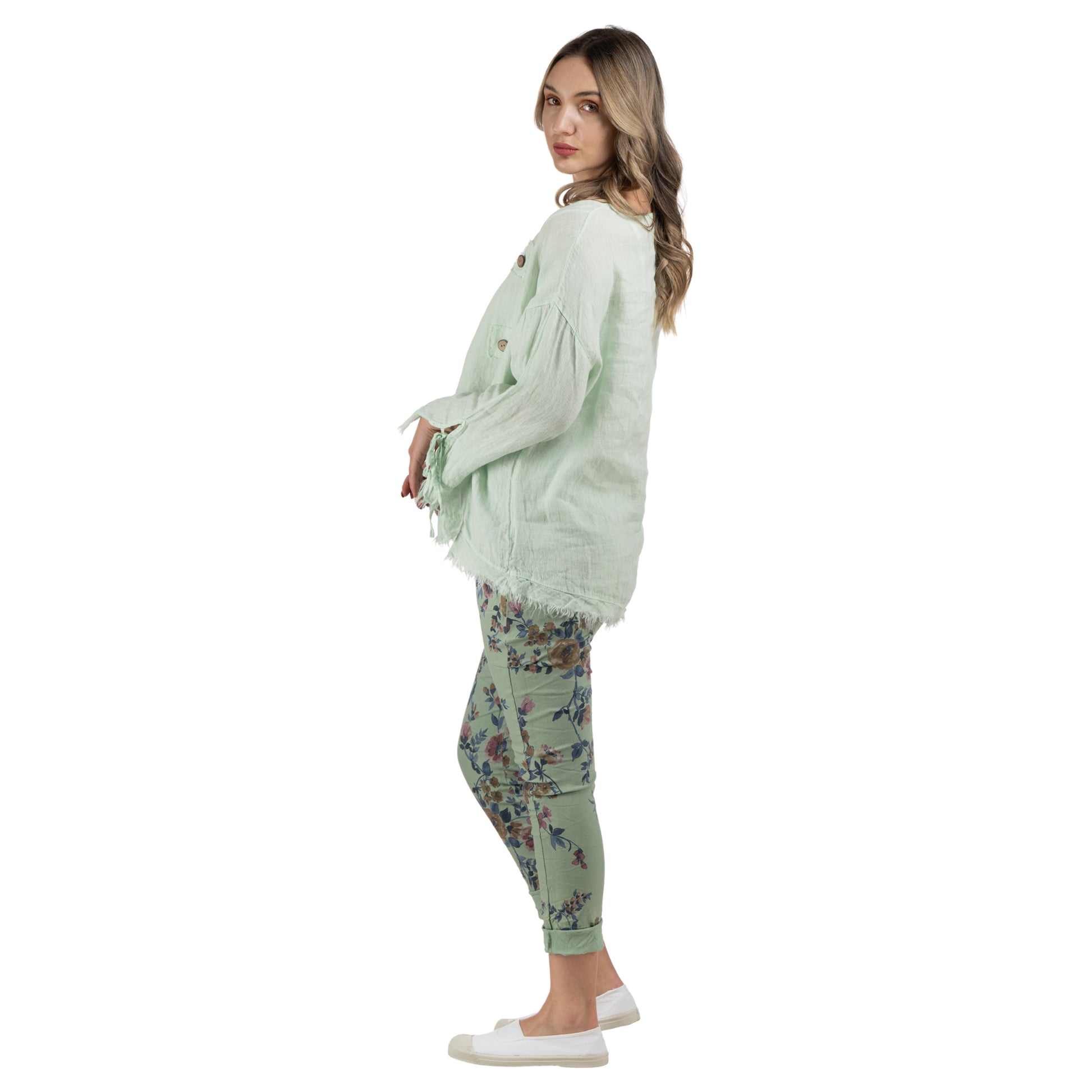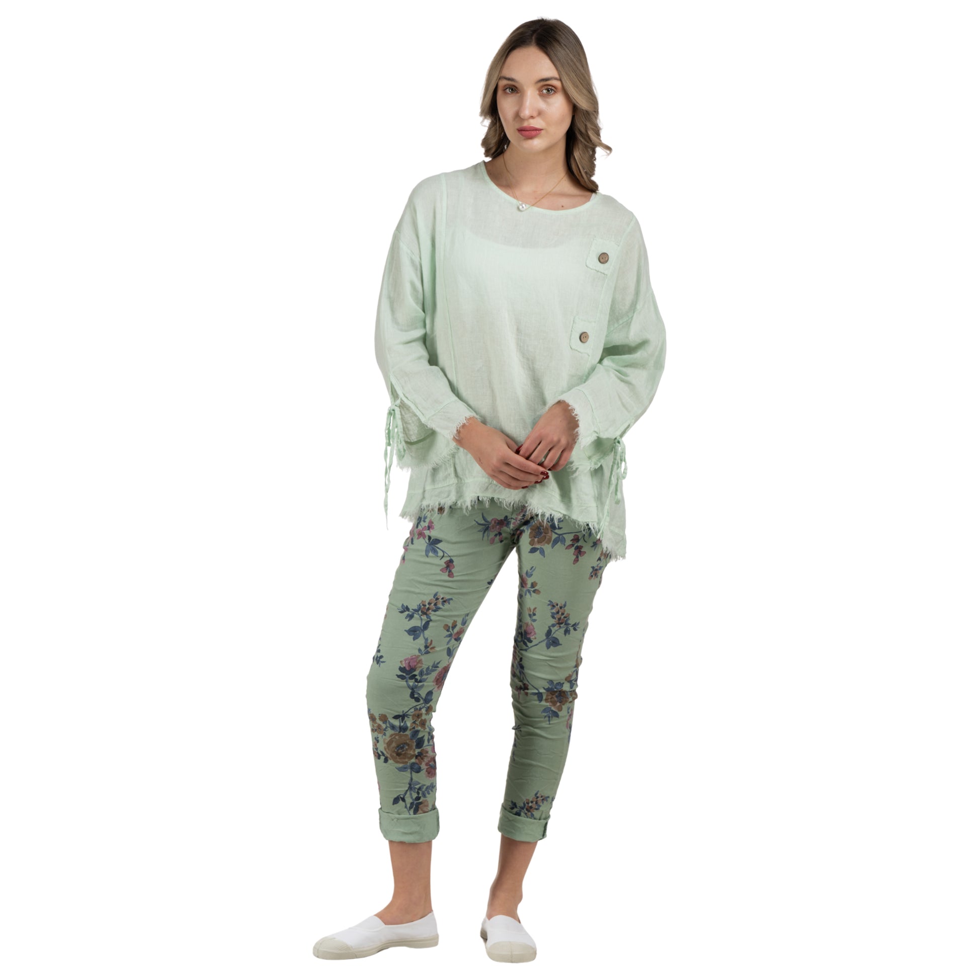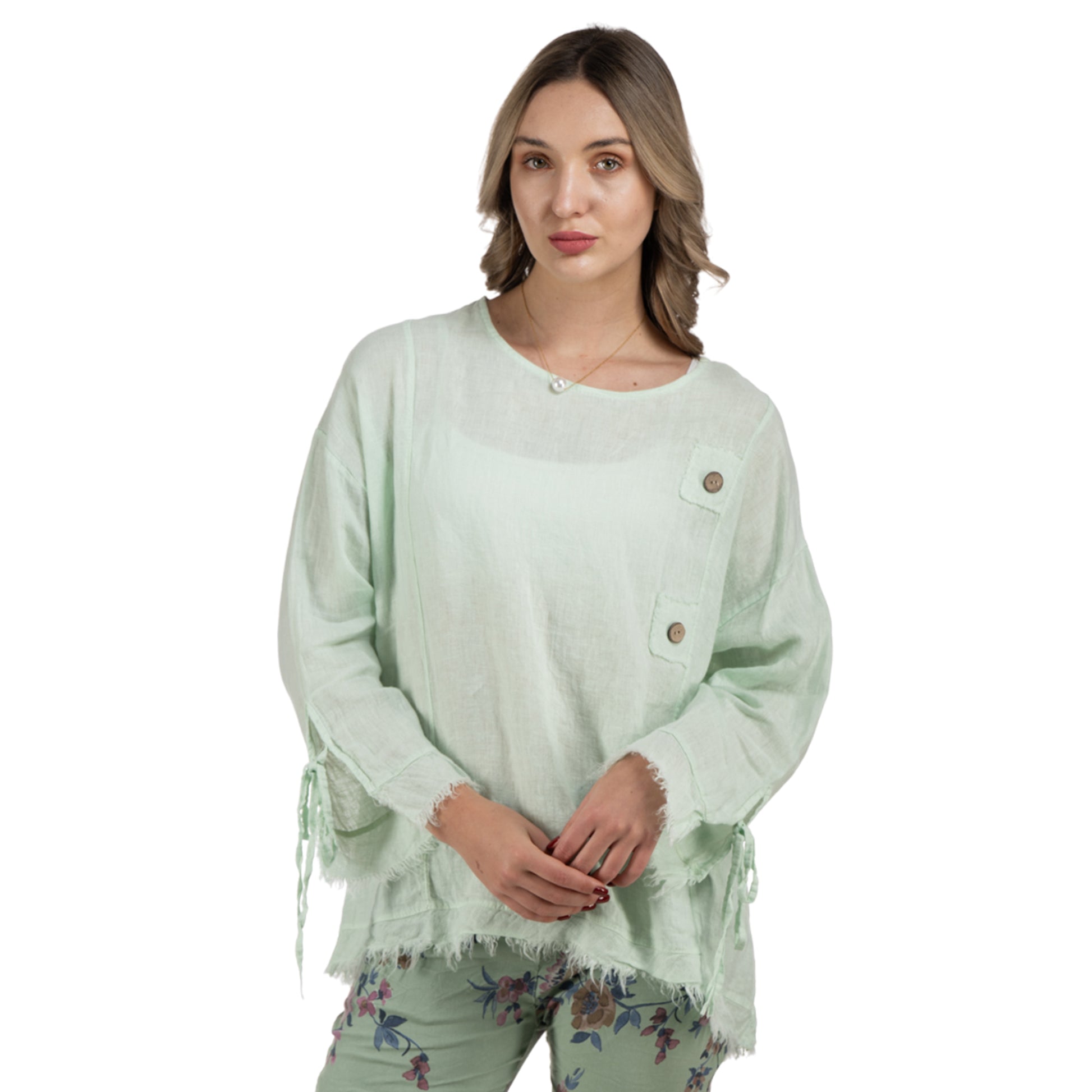 100% Linen button detail raw-edge top