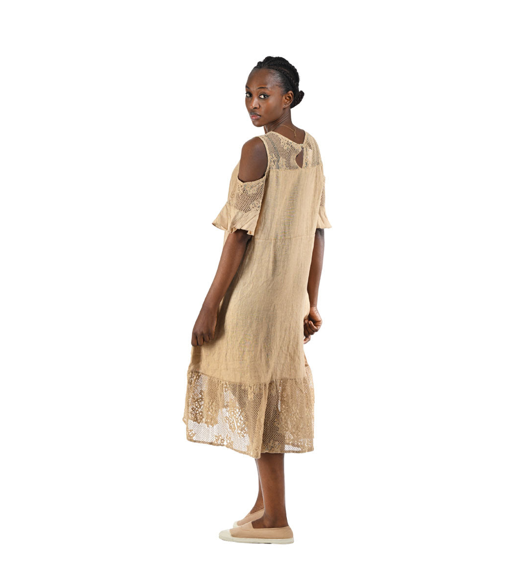 100% Linen cold shoulder lace trim dress