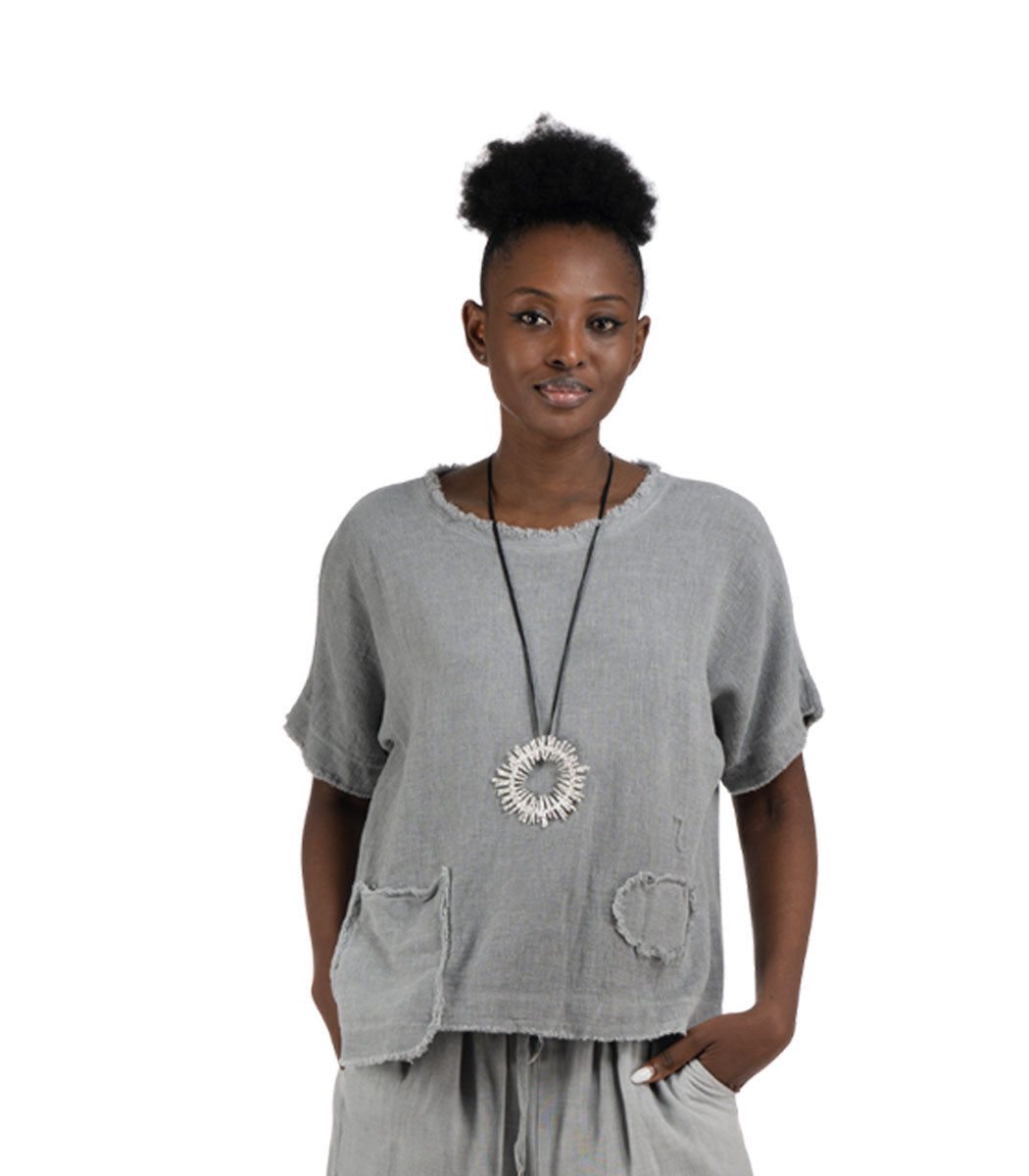 Raw-edge front pocket linen top
